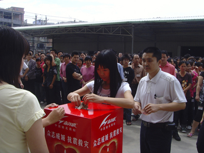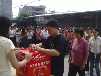 四川汶川發生的8.0級強烈地震,牽動了全國人民的心,喜得狼公司及集團所屬的鴻鵬公司董事會心系災區率先向災區捐出42萬的款物,隨后,公司員工1000余名自發組織賑災捐款儀式捐款,及時將款物送往災區,以此表達對災區人民的拳拳愛心!“喜得狼”四川分公司更是投入到災區的自發搶救中,讓我們時刻關注災區受災群眾,真心為他們祈福,祝愿他們早日重建家園,共享北京奧運。