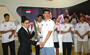 體博會安踏展區內,徐陽為出征“CBA安踏休斯敦訓練營”的球員“授劍”。