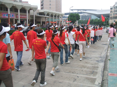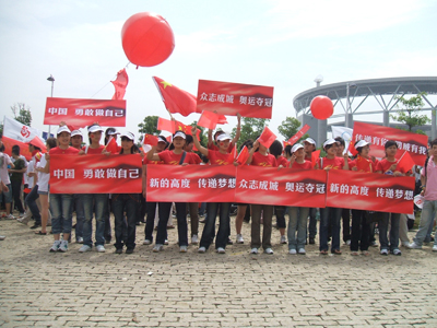 洶涌的人潮中,有一隊(duì)年輕人由361°合肥分公司組建的助威團(tuán)特別引人注目。這是一群頭戴白色的奧運(yùn)太陽帽,身著361°寓意騰“飛”的紅色T恤,火紅的國旗印在臉上的年輕人,他們在跟隨火炬?zhèn)鬟f的過程中盡情地歡呼著,手臂高高擎起無數(shù)紅色的標(biāo)語;“抗震救災(zāi) 中國加油”、“眾志成城 奧運(yùn)奪冠”、“傳遞有你 助威有我”、“中國 勇敢做自己”…… 激情的吶喊、熾熱的目光、有力的步伐,他們正用青春見證這一光榮的歷史時(shí)刻。