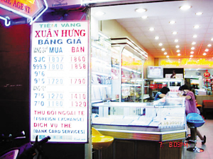 越南一家金店內顧客寥寥,金店門前廣告牌上寫著當天的金價。 時報特派記者 張配吉 林燕輝 攝