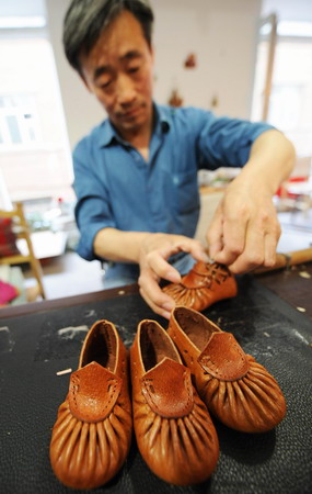 手工藝人李壽發在制作靰鞡鞋(6月11日攝)。靰鞡鞋是東北的特色民俗物品,目前其制作工藝重新被人們關注。靰鞡鞋經歷了“從穿到看”的轉型,從過去的日用品變成了如今的民俗旅游紀念品。“靰鞡”是滿語,意為“皮制防寒鞋”。新華社記者 王建威 攝