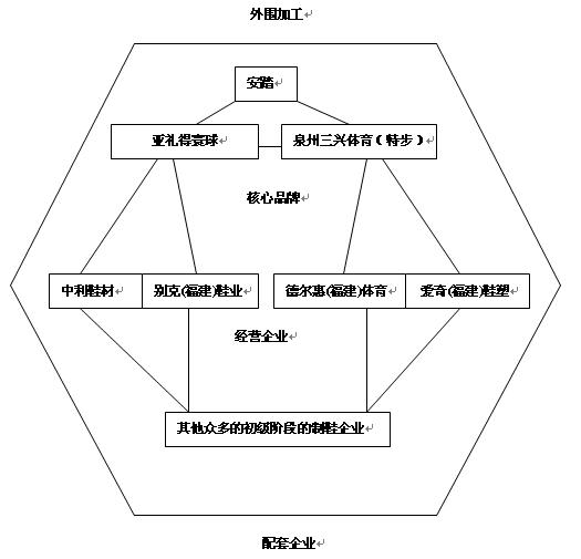 接下來我們就以晉江的鞋業集群為例,具體談談如何加強集群企業之間的互相合作與學習。晉江的鞋業集群發展至今,目前擁有制鞋企業3000多家,產業集群形成一定規模。在這之中既有安踏、特步等知名企業又有喜得龍、愛奇、德爾惠等快速發展的企業。晉江的鞋業企業可以用以下圖表示(少了喬丹,愛樂,貴人鳥,361度,金蘋果)