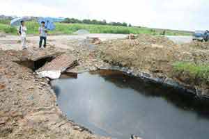 昨日上午,記者隨環保部門執法人員來到園洲鎮上沙路沙頭工業區時,一輛挖掘機正在“漏油現場”作業,據了解是輸油管道管理方的施工人員。小溪里已經基本看不到油污,但水邊被染黑的水草和泥土表明這里曾被污染。記者13日看到的污染最為嚴重的那個水坑,油污痕跡更明顯,空氣中還漂著一股油味。園洲鎮政府環保辦有關負責人告訴記者,廢油料被排入下水道后,正是從該水坑邊排出。