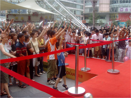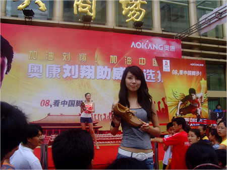 7月12,13日, “加油中國,加油劉翔——奧康劉翔助威團選拔活動”南京站在南京中央商場北門舉行。作為北京奧運會皮具產品供應商并以劉翔為形象大使的奧康集團,在南京選拔出2名“劉翔助威團”成員,并贈送奧運賽事門票回饋南京顧客。