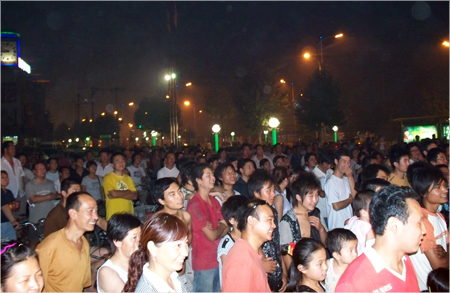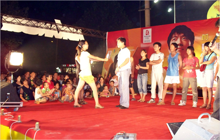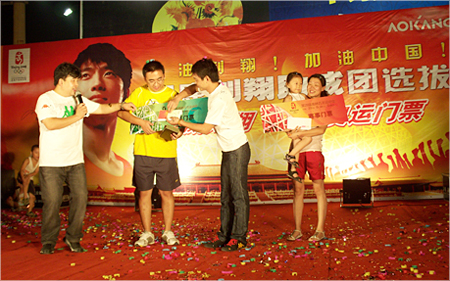 通過現場觀眾呼喊“加油中國,加油劉翔”的口號,以聲音分貝高低為標準,分貝最高者獲得觀看劉翔奧運賽事的奧運門票。