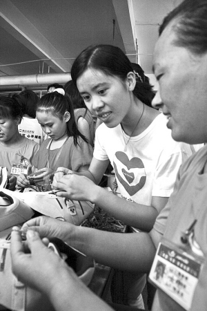 工人花五六秒鐘就能扎出一個漂亮的蝴蝶結,小記者們足足五分鐘才勉強扎出自己的“藝術之作”!拔以暮Y雖不及師傅們漂亮,但也收獲很多!學到了這項本事后,我就再不必為鞋帶老系不緊而煩惱了!”剛體驗完系鞋帶,小記者李玲說道。