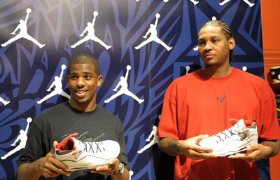 8月15日,美國男籃球員卡梅隆·安東尼(右)和克里斯·保羅在展示Jordan Gold新款籃球鞋。
