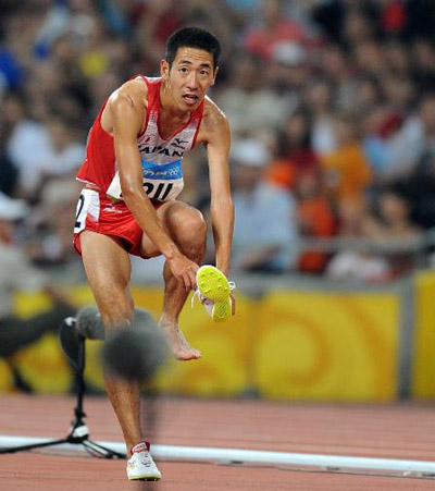 8月20日,北京奧運會田徑比賽在國家體育場“鳥巢”繼續(xù)進行。圖為日本選手松宮隆行在男子5000米第一輪比賽結(jié)束后撿起比賽中掉落的鞋。