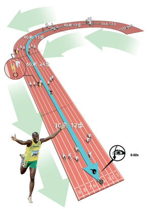 從彎道進入直道最后幾米,博爾特身體逐漸減少內傾程度,自然轉入直道,動作十分流暢,每個細節都令人吃驚。他有世界上最好的中途技術,進入直道更沒有敵手,速度令人感到恐怖。