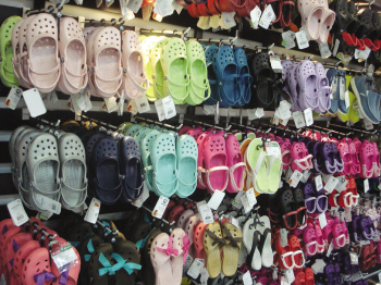 Crocs鞋圓頭闊身、鞋面有透氣小孔,這款涼鞋被戲稱為“洞洞鞋”,今夏在我市熱銷。“去年剛來溫州的時(shí)候,還只是看的人多,買的人少。今年夏天一個(gè)專柜一天可以賣30多雙,經(jīng)典款經(jīng)常出現(xiàn)斷碼情況。Crocs代理商梁小姐如是說。