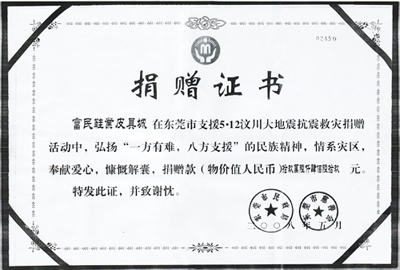 四川汶川大地震發(fā)生后,富民鞋業(yè)皮具城內(nèi)管理人員及商戶心系災(zāi)區(qū),在東莞市支援5·12汶川大地震抗震救災(zāi)捐贈(zèng)活動(dòng)中,及時(shí)伸出援助之手,慷慨解囊,共捐款196469元。近日,東莞市民政局、東莞市慈善會(huì)特為富民鞋業(yè)皮具城頒發(fā)捐贈(zèng)證書(shū)。