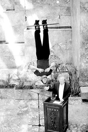 18日,在美國紐約中央公園,大衛·布萊恩(倒立者)為人們演示他將如何挑戰倒掛世界紀錄