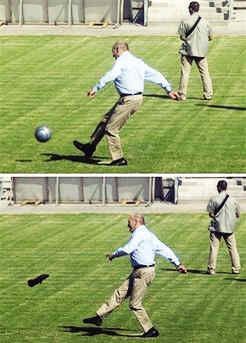 只見奧爾默特抬腿一腳,自己的鞋與球一起飛了出去。有目擊者說,奧爾默特本人也“啞然失笑”。他目前丑聞纏身,警方當天宣布要對他進行新一輪問訊,不知此事是否影響了他的心情。