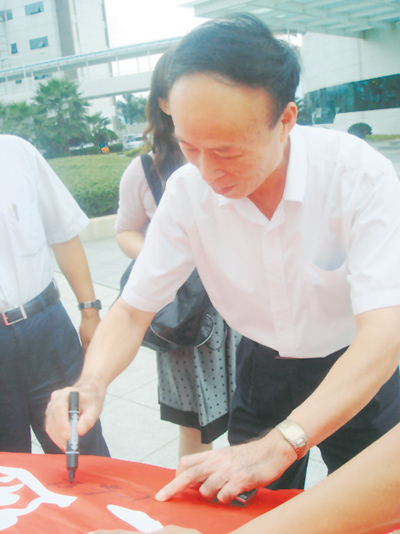正泰集團高級顧問、黨委副書記顏厥忠給淄博采訪團簽名。(伊茂林 攝)