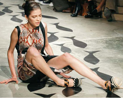 在PRADA2009春夏發布會上超模新星KATIE FOGARTY等人被設計有問題的鞋子摔倒