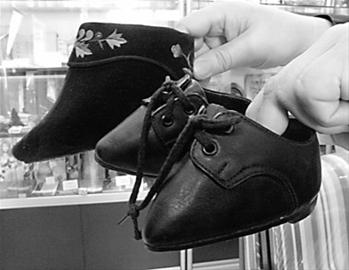 昨日記者看到的清末西式“三寸金蓮”鞋是牛皮的 ,相比旁邊的“國貨”三寸金蓮顯得時尚一些。 首席記者 王志東 攝