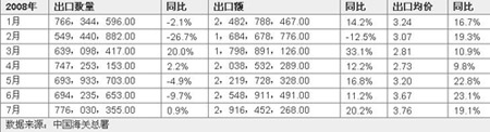 近期在原料價格持續高漲、人民幣對美元不斷升值、勞動力成本增加、出口退稅率下調等諸多因素的作用下,我國鞋出口量出現明顯下降。據海關統計,今年1-7月我國出口鞋48.7億雙,比去年同期(下同)下降3.9%,而去年同期出口同比增速為13.2%;價值156.9億美元,增長13.0%;出口平均價格為3.76美元/雙,上漲37.0%。表1-4和圖1-5、1-6、1-7、1-8、1-9為2008年1-7月份我國鞋出口統計數據的變化及與2007同期相比增長情況: