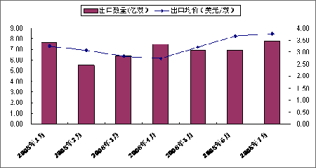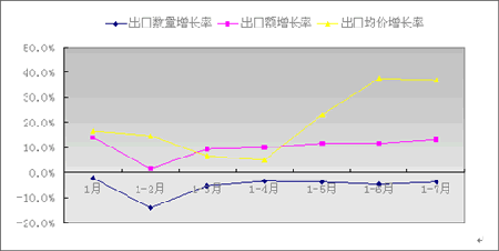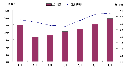 一、月度出口量有所回升,出口均價大幅上漲。7月份當月出口鞋7.8億雙,同比增長0.9%,環比增長11.8%。7月份當月出口均價達3.76美元/雙,同比漲幅達19.1%,比5月和6月份略有下降。圖1-9和圖1-10分別為1-7月份我國鞋出口數量和出口金額走勢情況: