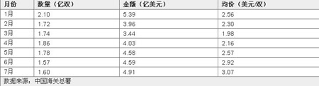 據(jù)海關(guān)統(tǒng)計(jì),2008年上半年,福建省鞋出口9.3億雙,比去年同期(下同)下降0.5%,價(jià)值24.4億美元,增長(zhǎng)5.9%。出口的主要特點(diǎn):
