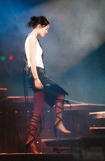 99年演唱會上王菲的一雙黑色綁帶Jeremy Scott無底鞋將她的穿鞋品味推至了最高峰。