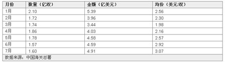 (3)對美國出口下降,對歐盟出口小幅增長。上半年,福建省對美國出口鞋3億雙,下降6.6%;對歐盟出口2億雙,增長3.9%。對上述兩地合計占同期福建省鞋出口總量的53.8%。