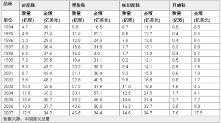 表1-6為1994至2007年間我國鞋類出口分品種統計數據: