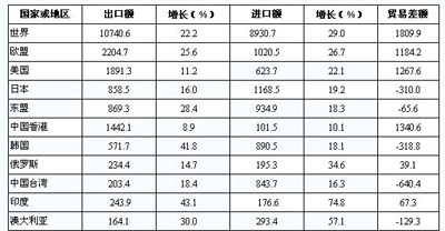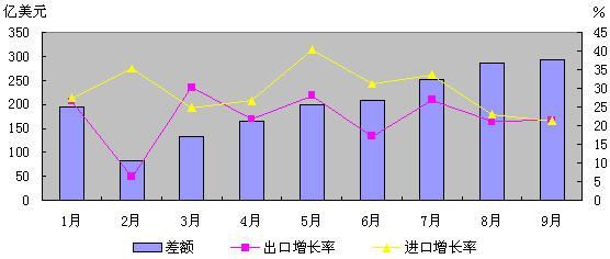 在連續6年快速增長的基礎上,今年前三季度中國商品進出口總額達到19671.3億美元,比去年同期增長25.2%。其中,出口總額10740.6億美元,增長22.2%,比去年同期回落4.9個百分點;進口總額8930.7億美元,增長29.0%,比去年同期加快9.9個百分點。進口增速4年來首次超過出口增速,貿易平衡狀況有所改善,外貿順差1809.9億美元,比去年同期下降2.7%。