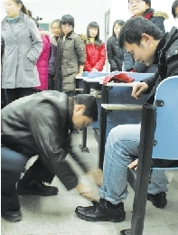 杜女士:12月11日,鄭州天宇飼料科技有限公司董事長葉傳林,在給鄭州牧業工程高等專科學校50多名應屆大學畢業生講課時,為告訴在校大學生勞動無貴賤,葉傳林突然彎下腰,給一名學生擦皮鞋(右圖),這一幕震撼了在場的每一個人。
