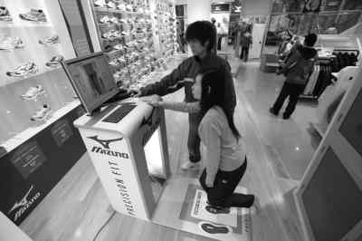 高弓足、低弓足,不同腳型對鞋的要求也不同。近日,一種腳型測量儀亮相北京各大運動品牌店,利用三維立體數據判斷測試人的腳型、尺碼、關節靈活度和適合的鞋型等。圖為顧客正進行關節靈活度檢測,幫助挑選運動鞋。