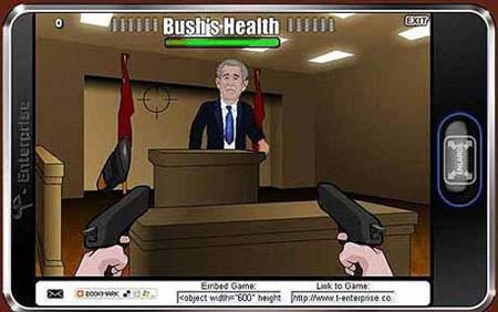 據英國《每日電訊報》15日報道,此款游戲名叫“布什之臭鞋子訓練營”,只需不斷點擊鼠標左鍵,游戲者就可以向布什發射炮彈或扔臭鞋子,每擊中一次,布什的生命值就會減一分,直到最終被打死,游戲者贏。