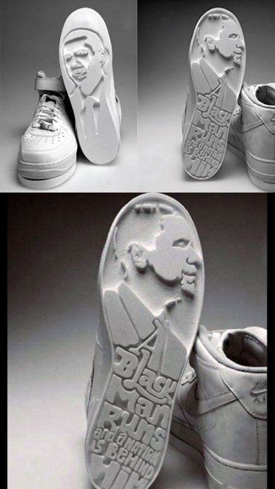 兩只鞋的鞋底并不一樣,左腳寫著文字“A Black Man Runs And A Nation Is Behind Him”,有趣。當穿上它,留下的腳印,全是奧巴馬。