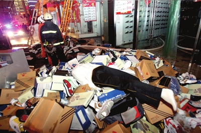 昨晚6點15分,記者在現場看到,出事店鋪門前堆著數千件被水浸泡過的衣物,店內商品已被清空。該路段10余家店鋪受連累停電,已關門停業。七八輛消防車停在路邊,消防隊員正在清理現場。出事路段近百米水沒腳面,行人只得在自行車道上穿行。