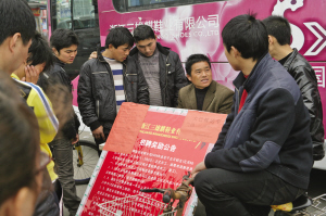 一家民企在大客車邊上擺起招聘攤位,公布招聘獎勵辦法。