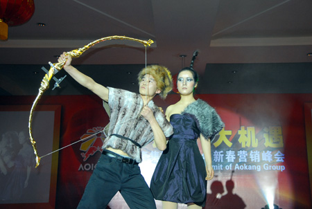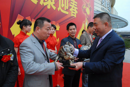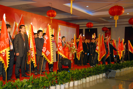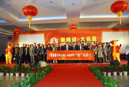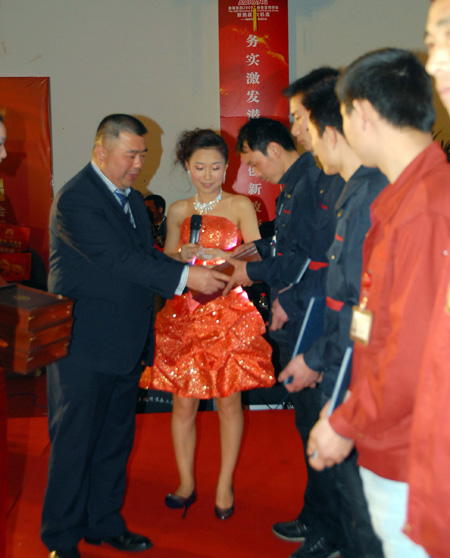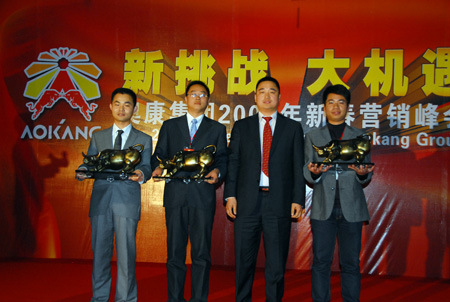 緊接著,集團總裁王振滔為奧康30幾位分公司經理各頒發了一座意義特別的雄牛雕塑,希望奧康的事業在所有營銷精英的努力下牛勁十足,更上層樓。浙江移動永嘉分公司的總經理方如利也到現場祝賀奧康開工,送上超級牛號“158*7777777”,奧康還與移動合作將陸續為新進員工免費提供手機2009部。