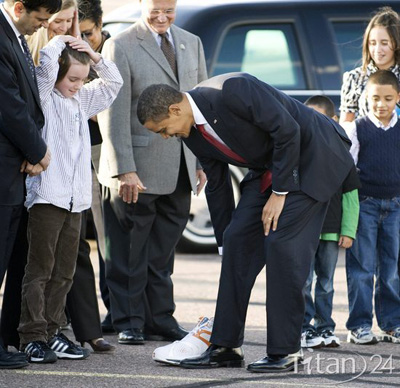 2009年2月17日,美國新上任的總統(tǒng)奧巴馬乘坐空軍一號抵達菲尼克斯,為全明星喝彩。在比賽間隙,他還專門和太陽隊中鋒奧尼爾比試球鞋。可想而知,奧巴馬的球鞋根本無法和歐碼為23碼的奧尼爾球鞋比高下。