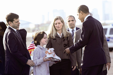 2月17日,美國總統奧巴馬乘空軍一號造訪亞利桑那州鳳凰城,這個剛剛舉行過NBA全明星賽的城市。鳳凰城市長費里·高登的兒子杰克·高登(左二)別出心裁,將NBA籃球明星沙奎爾·奧尼爾的簽名籃球鞋送給奧巴馬以表示歡迎。