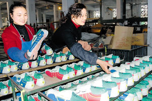 建甌市工藝鞋廠通過兼并同為生產保齡鞋的建甌鑫旺鞋業有限公司,成立了建甌市九州保齡鞋廠。新企業通過加大技改力度,開發出保齡鞋袋等4種新產品,并增加60多臺設備,還吸收了40多名下崗工人,使企業生產能力提高30%,成為福建省最大的保齡鞋生產企業,產品被美國客商包銷。圖為員工在檢驗出口美國的保齡鞋。(魏永青 方明 攝)