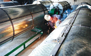 春節以來,永興機械制造有限公司已銷出茶業機械180多臺套,訂單達到500多臺套,較去年同期增長120%。圖為日前,武夷山市永興機械制造有限公司茶機制造車間的工人在焊接揉茶機。(邱汝泉 攝)