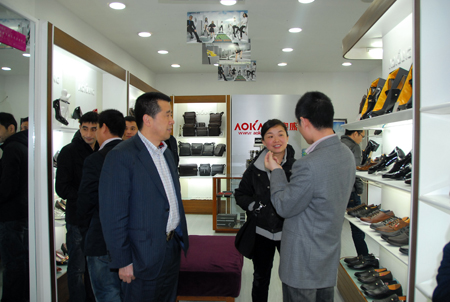 以副總裁趙樹清帶領的另一支考察團則來到江西上饒,在當地代理商蘇群紅的引導下考察了當地市場。據蘇群紅介紹,她在上饒代理奧康品牌已經長達十年,目前共有兩家專賣店,她正計劃進駐當地商場和大賣場。