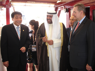 中國(guó)鞋網(wǎng)3月18日訊 2009年3月12日,廣州2010年亞運(yùn)會(huì)高級(jí)合作伙伴361°在科威特Courtyard Hotel成功簽約亞奧理事會(huì)(英文縮寫:OCA),既而成為亞奧理事會(huì)全球官方贊助商。出席此次會(huì)議的有:國(guó)際奧委會(huì)主席羅格、亞奧理事會(huì)主席艾哈邁德•法赫德•薩巴赫親王、亞組委常務(wù)副秘書長(zhǎng)、廣州市副市長(zhǎng)許瑞生以及361°代表等。會(huì)上羅格主席在亞運(yùn)留言橫幅上用中文簽名,表達(dá)了其對(duì)廣州亞運(yùn)會(huì)的支持。