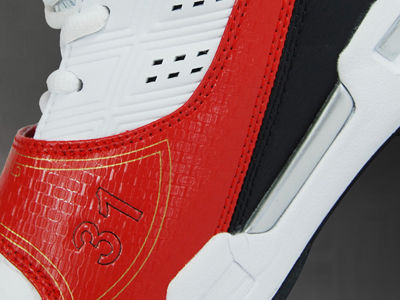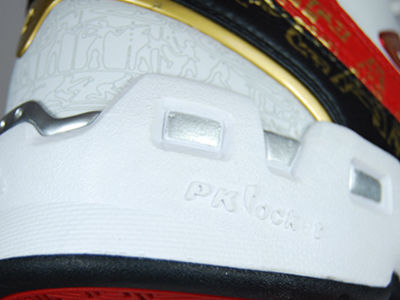 幫面內側的三組沖口,可以有效的幫助散熱,增加舒適度。在幫面內側的魔術扣上印有巴蒂爾的隊號,突出簽名鞋的特點。