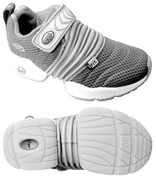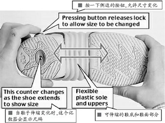 這種鞋子樣子有點像節肢動物尺蠖,因此這種鞋也叫“尺蠖鞋”(inch-worms)。鞋分前后兩個部分,通過中間可伸縮的橡膠連接起來。這種可以和孩子一起長大的童鞋最大可以增長一倍。當孩子的腳越長越大時,家長只需把它調整到最佳尺寸即可。