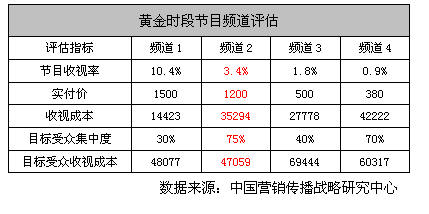 當我們綜合目標受眾集中度、收視成本考察一下,結果會全然不同。由于頻道2目標受眾與企業的營銷對象吻合度高,目標收視成本最低,綜合性價比最高。