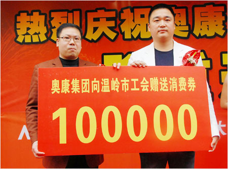 開業剪裁的鑼鼓聲里,隨著溫嶺總工會副主席朱正斌從集團副總裁王振權手中接過10萬元消費券,全場響起掌聲。