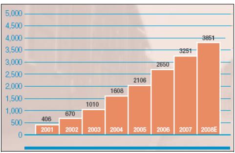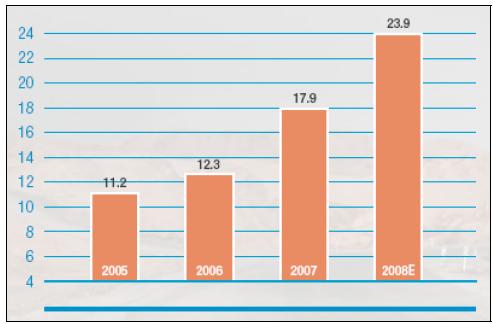 圖表 2005-2008財年鴻星爾克年產(chǎn)能