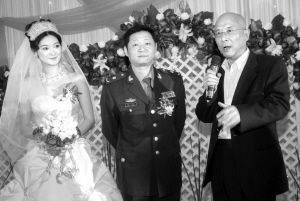 現場:迎親這個環節遭取消了,因為新娘的娘家是在東北,那么遠莫辦法去,趙亮解釋說:“她家在那兒,根本無法迎親。”所以新娘就直接待在酒店里化妝。在衣服選擇上,趙亮硬是沒有選擇傳統西式婚禮的白色禮服,可能是覺得各人不夠玉樹臨風,就選擇了一套軍裝。來賓接待的排場就大了,分了10個人分別負責不同的人群,因為87桌,確實人嘿多。