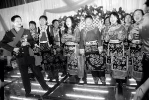 現場:整個婚禮過程簡單得不行,開香檳、切蛋糕、喝交杯酒等全都看不到,就直接一個培訓學校的負責人上臺,說聘請了趙亮當他們的榮譽校長,然后說這個學校專門給農民工免費培訓。接下來,汶川草坡鄉的村民,就上臺開始唱羌族的祝酒歌,還走了幾次音,然后雷人地調節了下氣氛。歌一唱完,新郎新娘就退場了,讓人等了半天的拋花球環節也遭抹殺了。
