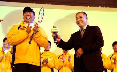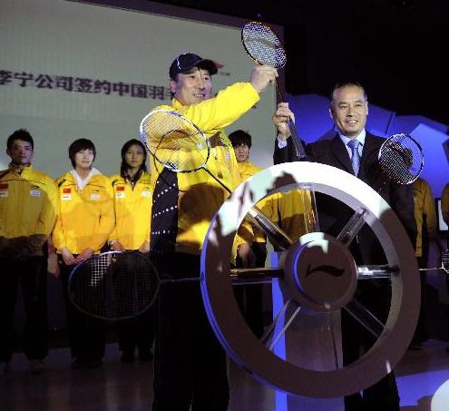 4月23日,中國羽毛球隊總教練李永波(左)與李寧在簽約儀式上。當日,李寧公司正式與中國國家羽毛球隊簽約。李寧公司將在器材、服裝等方面給予國家羽毛球隊大力支持。