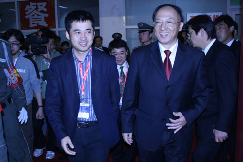 安踏體育用品有限公司董事局主席兼CEO丁志忠和國家體育總局局長劉鵬一起步入安踏展廳