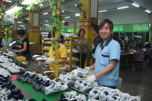 圖為賜予鞋業(深圳)公司的員工正在忙碌的生產線上。
